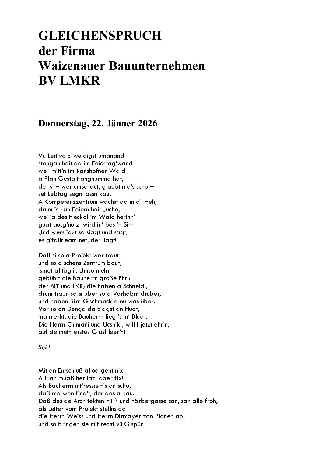 Besonderes Highlight: Den traditionellen Gleichenspruch, vorgetragen vom Bauleiter, möchten wir Ihnen nicht vorenthalten. Wir haben ihn daher als Foto beigefügt – viel Freude beim Lesen!