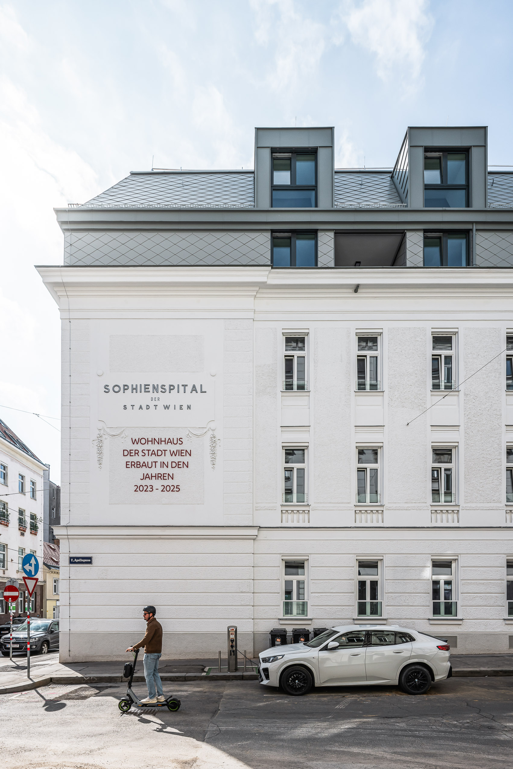 Das Projekt verbindet Bestand und Neubau zu einem zukunftsfähigen Ganzen: Der historische Verwaltungstrakt des ehemaligen Sophienspitals wurde umfassend saniert und durch einen Neubau sowie einen zweigeschossigen Dachausbau ergänzt. Insgesamt konnten so 46 hochwertige und zugleich leistbare Wohnungen für rund 120 Bewohner:innen realisiert werden.