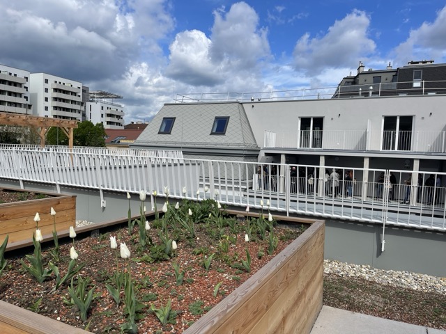 Ergänzt wird das Wohnangebot durch vielfältige Gemeinschafts- und Infrastruktureinrichtungen, darunter begrünte Freiräume, ein Gemeinschaftsdachgarten, Sport- und Mehrzweckflächen sowie eine Arztpraxis im Erdgeschoss.