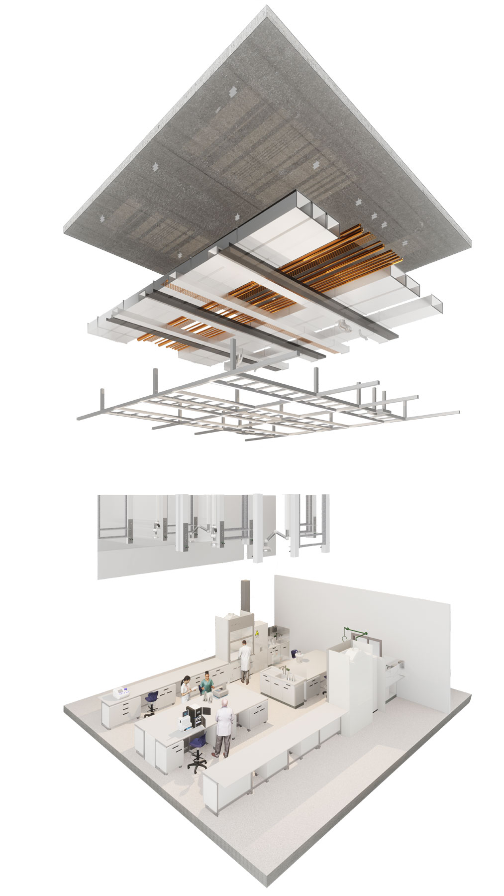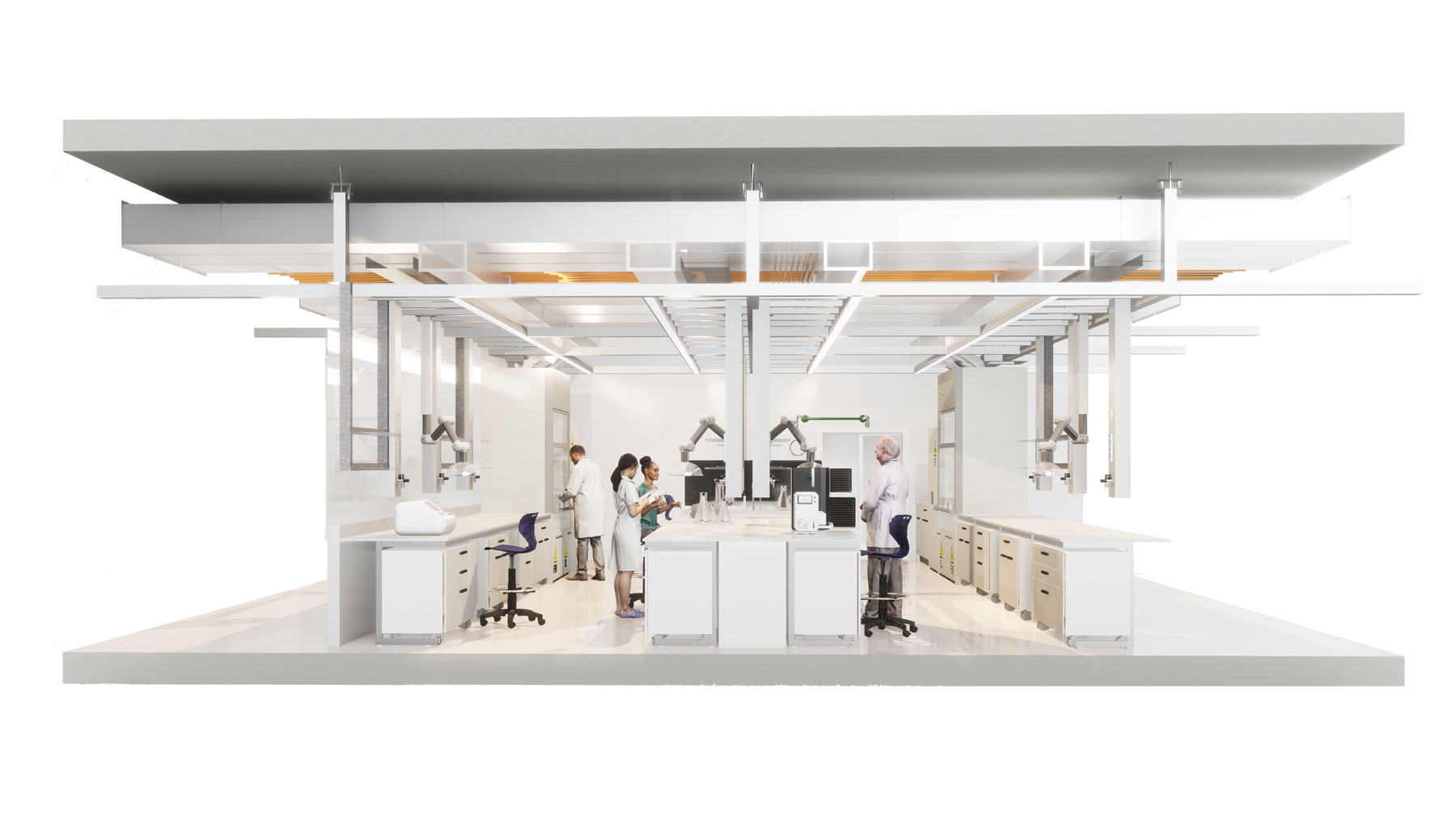 Der Baukörper ist in drei gleichwertige Bauteile geteilt und weist eine orthogonale Grundrissstruktur auf. Damit ist eine effiziente Labornutzung (z.B. Raumteilungen, Möblierbarkeit) und eine modulare Bespielung der Hybridzone möglich.