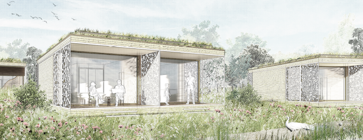 Die Gebäude sind als niedrige Baukörper mit begrünten Flachdächern gedacht und setzen einen zeitgemäßen architektonischen Akzent. Photovoltaikmodule am Hauptgebäude werden zurückhaltend integriert, während Holzbauweise und nachhaltige Materialien die ökologische Ausrichtung des Konzepts unterstreichen.