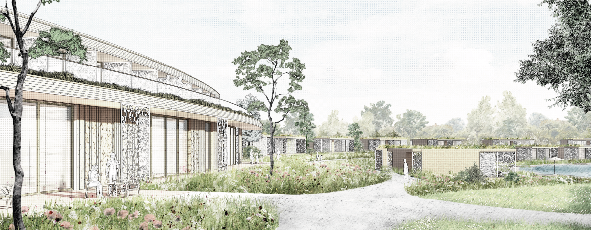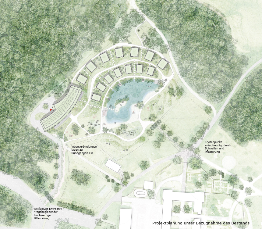 Ruhige Baukörper, geringe Gebäudehöhen, begrünte Dächer und ökologische Materialien lassen die Anlage mit der umgebenden Natur verschmelzen. Neue Baumpflanzungen verzahnen das Areal mit dem angrenzenden Wald. Die Architektur tritt dabei bewusst in einen Dialog mit den historischen Gebäuden von Schloss und Gutshof, ohne mit ihnen zu konkurrieren.