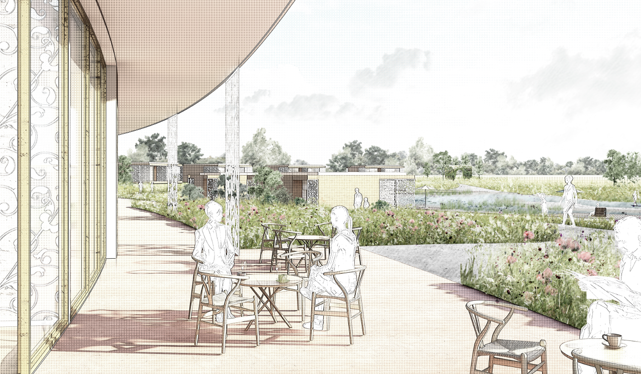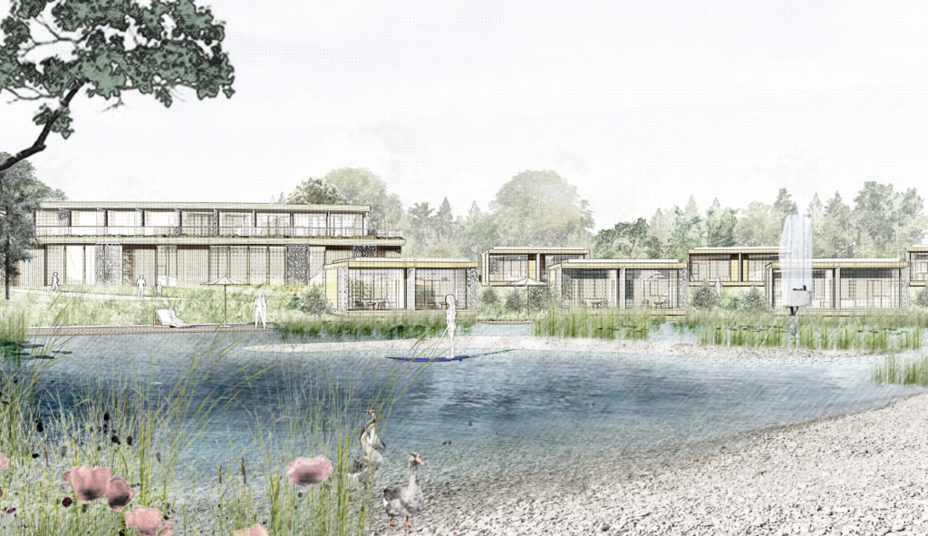 Im Rahmen eines Wettbewerbs wurde ein „kaiserliches und konkaves“ Konzept für den Neubau eines Sees mit umliegendem Hotel mit Chalets entwickelt.