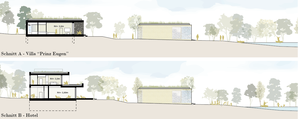 Nördlich von Schloss Hof wurde ein Hotelensemble aus einem zweigeschossigen Haupthaus und vierzehn kleinteiligen Villen konzipiert. Die Bebauung folgt der natürlichen Topographie und fügt sich sensibel in die Landschaft ein: Eingeschossige Suiten rahmen in konkaven Reihen den See, während sich das Hauptgebäude im konvexen Gegenschwung in Richtung Schloss öffnet. Die Formensprache nimmt Bezug auf barocke Garten- und Zierelemente.
