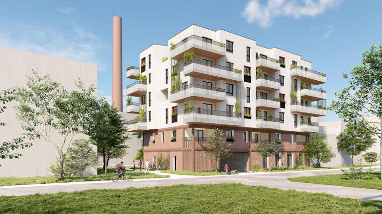 Die Materialwahl, insbesondere die Ziegel, verleiht den Gebäuden eine zeitlose Ästhetik und sorgt gleichzeitig für Langlebigkeit und eine harmonische Integration in die umgebende Landschaft. Die klare, strukturierte Gestaltung der Fassaden und die abwechslungsreiche Nutzung der Gebäudehöhen – von 2 bis 6 Stockwerken – sorgen für eine dynamische Silhouette, die sich dennoch respektvoll in das bestehende Stadtbild einfügt.
